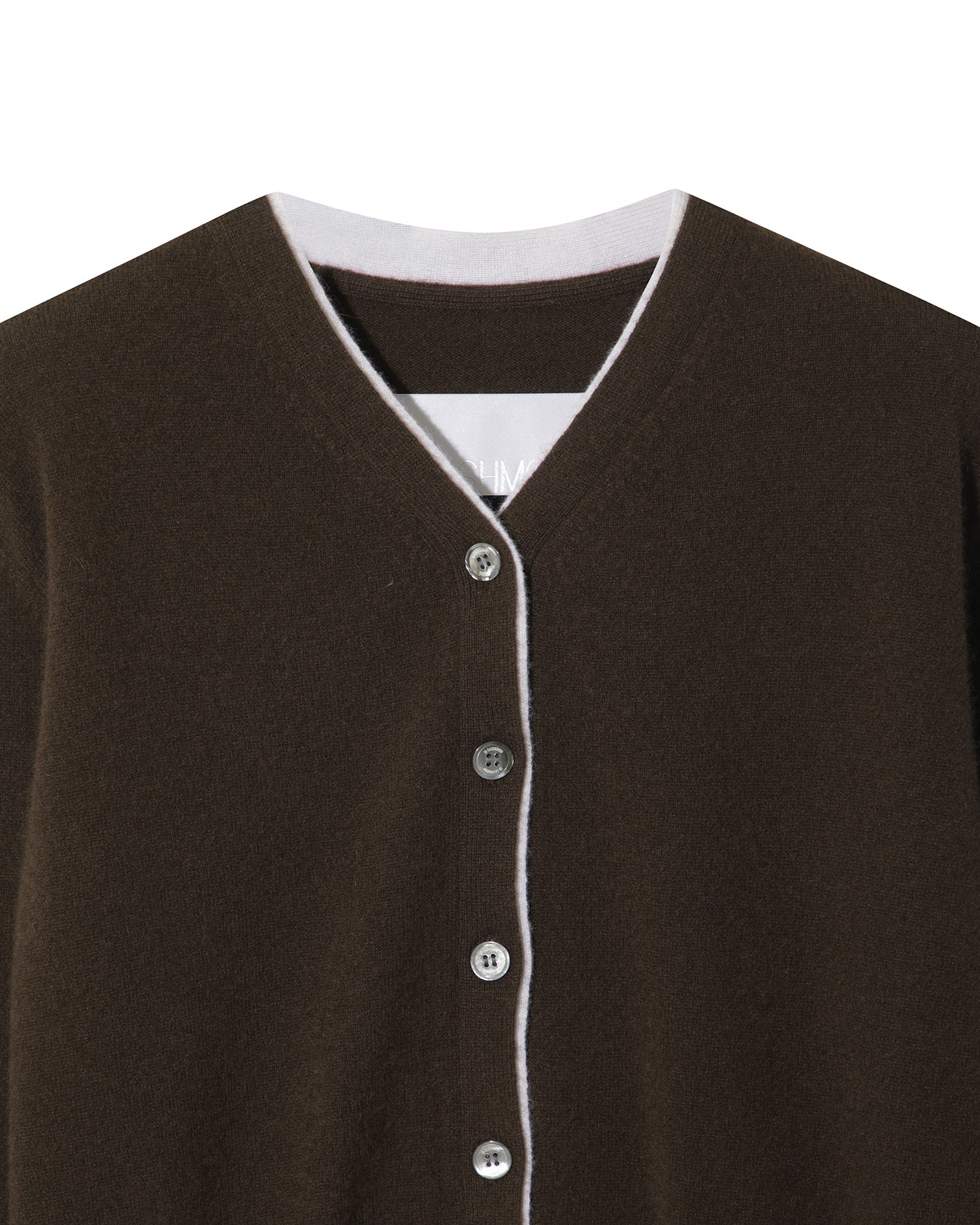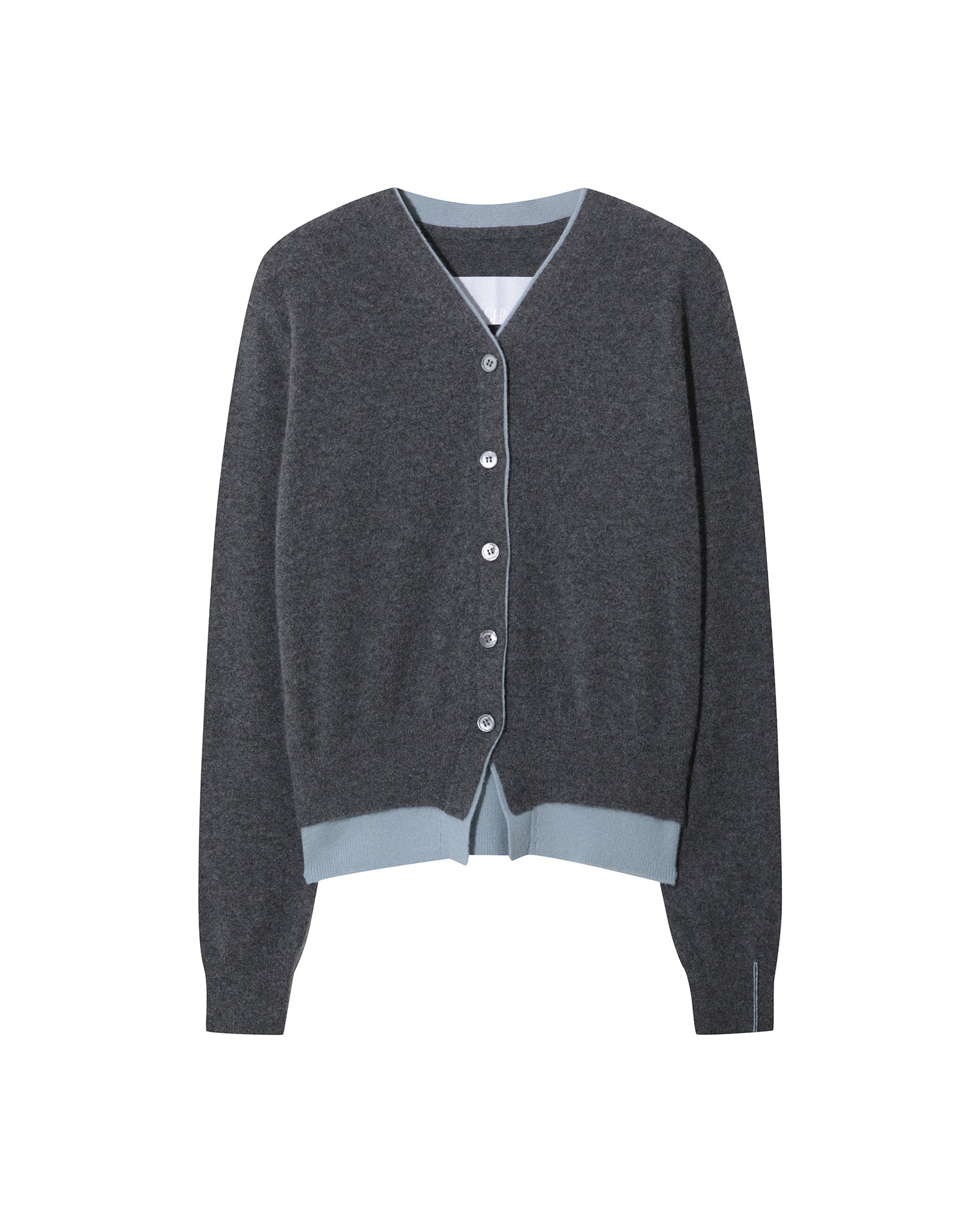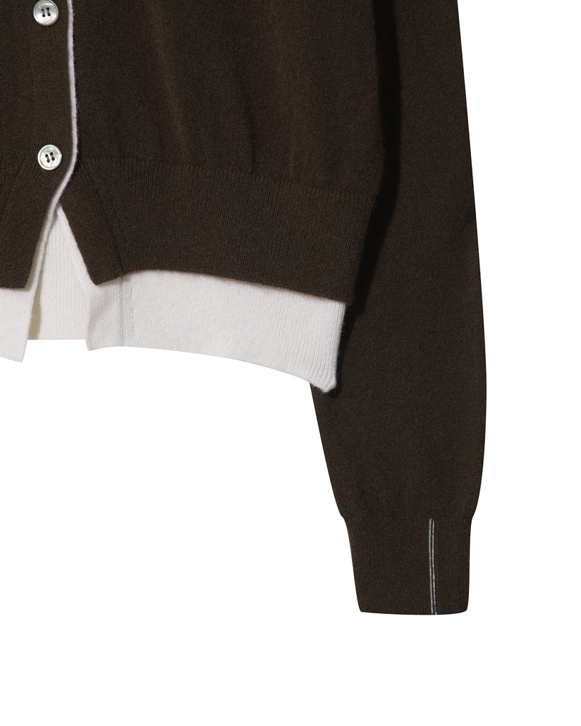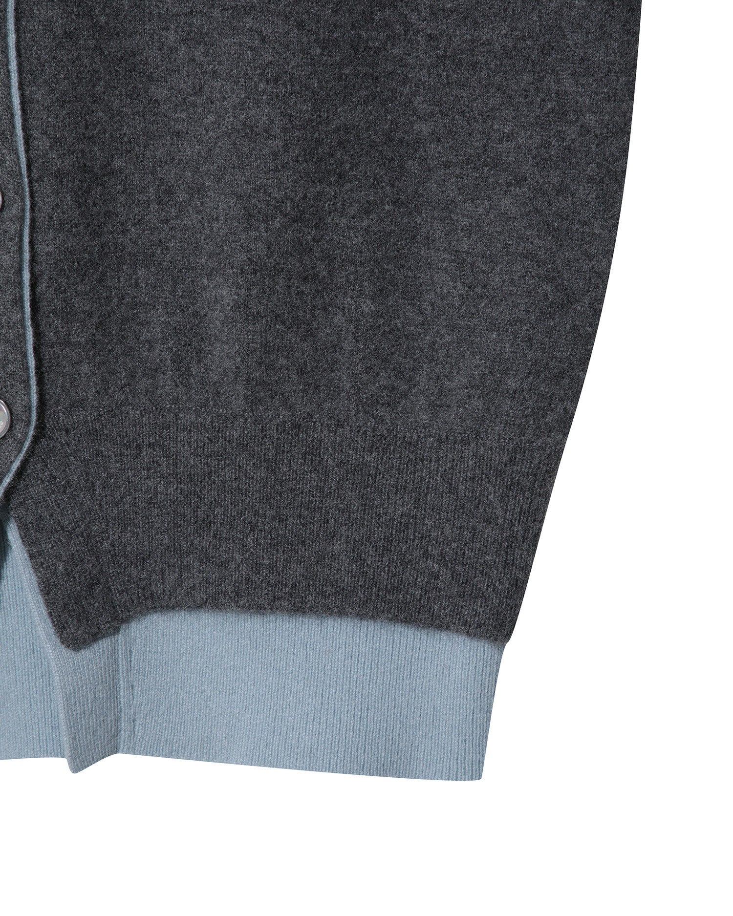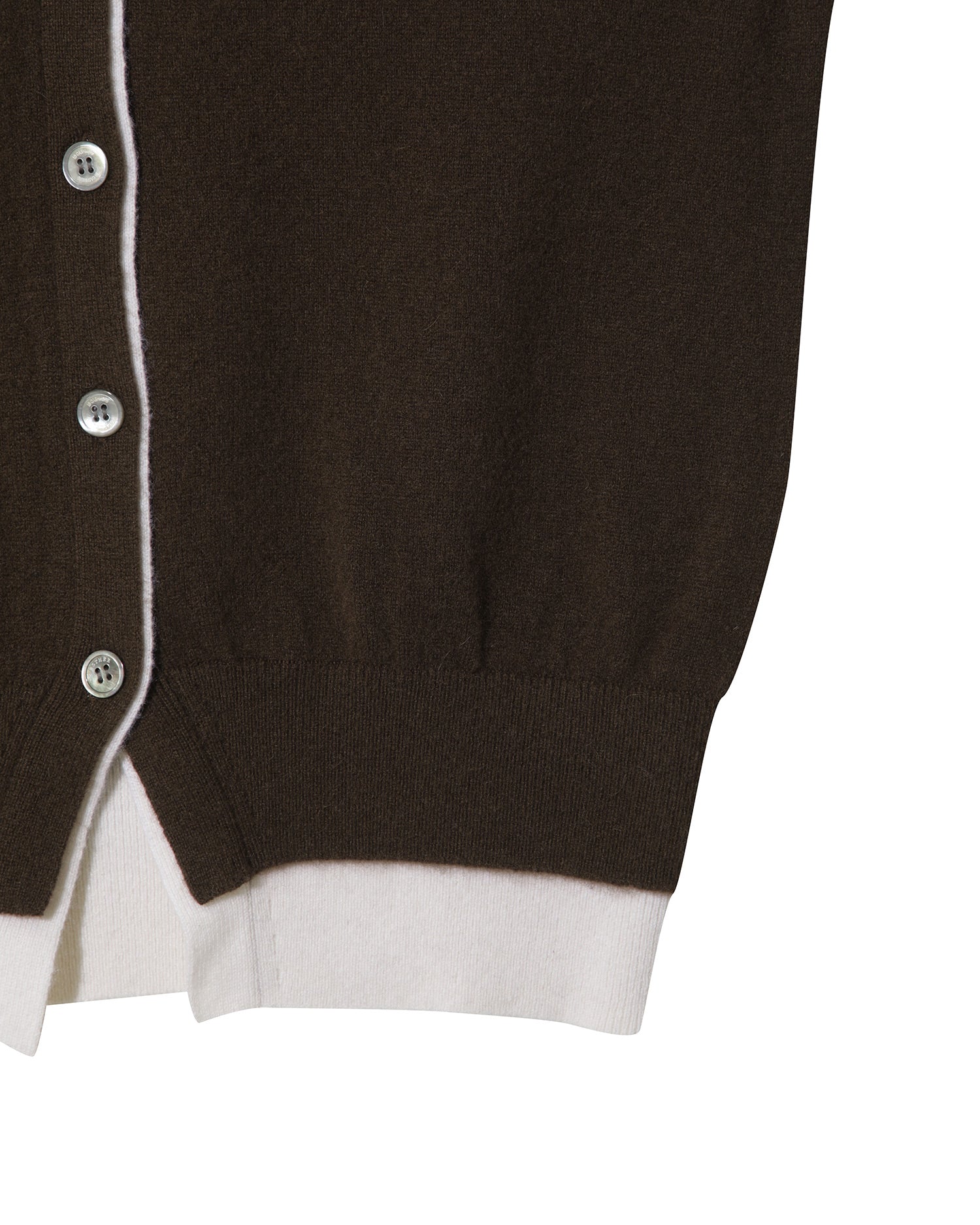 Cashmere cardigan that looks naturally layered on its own. In dark gray with light blue accents and brown with ivory tones, each colorway features a refined, effortless combination.