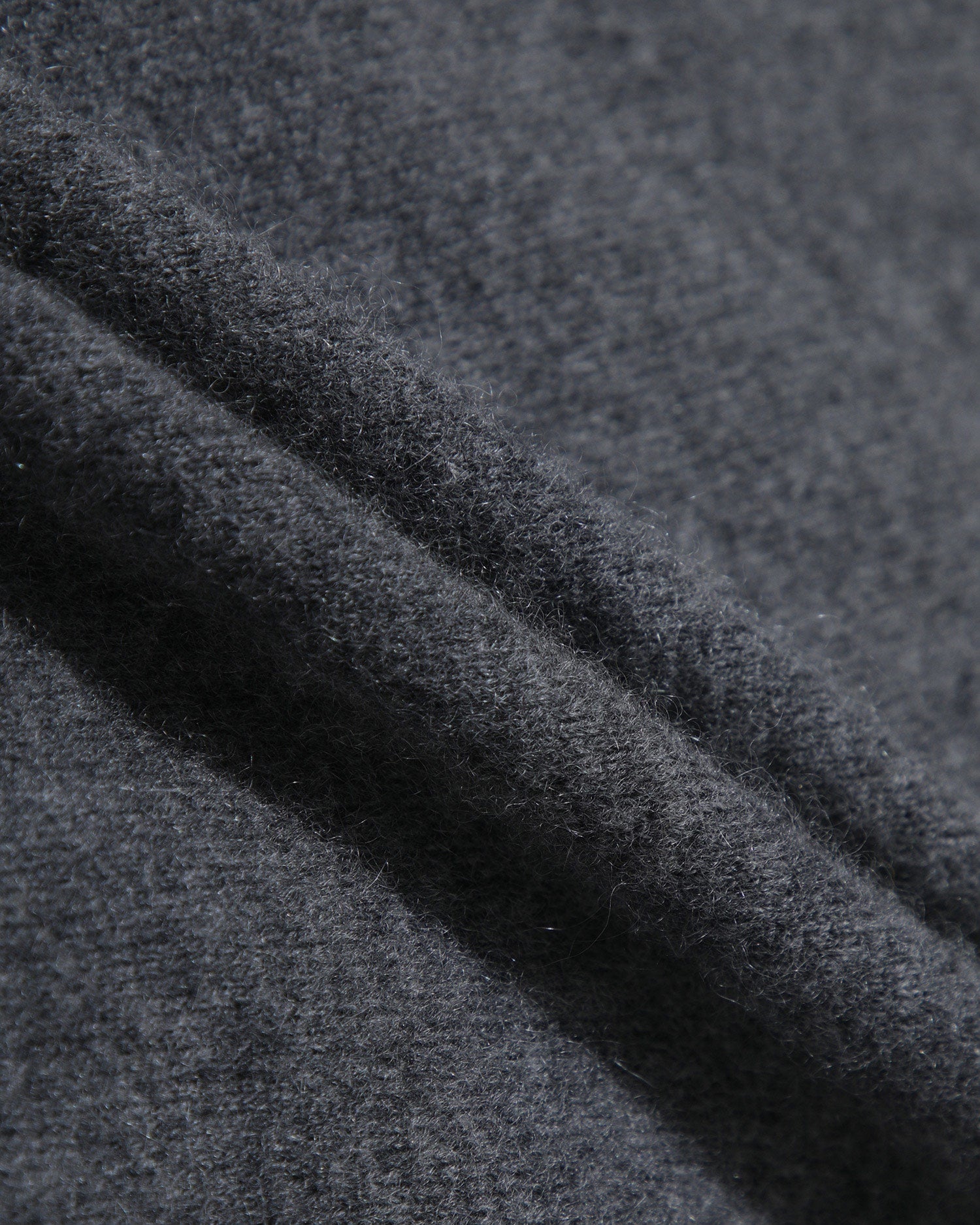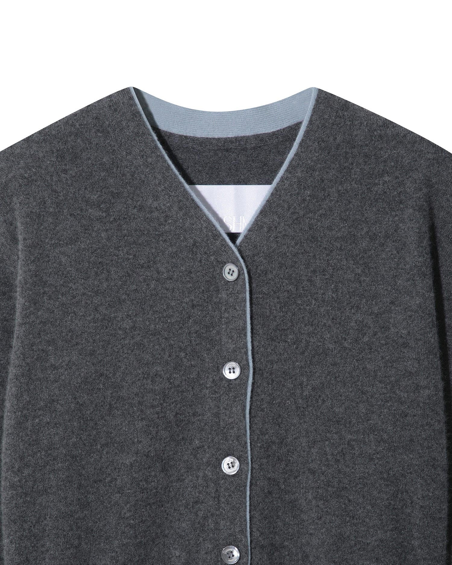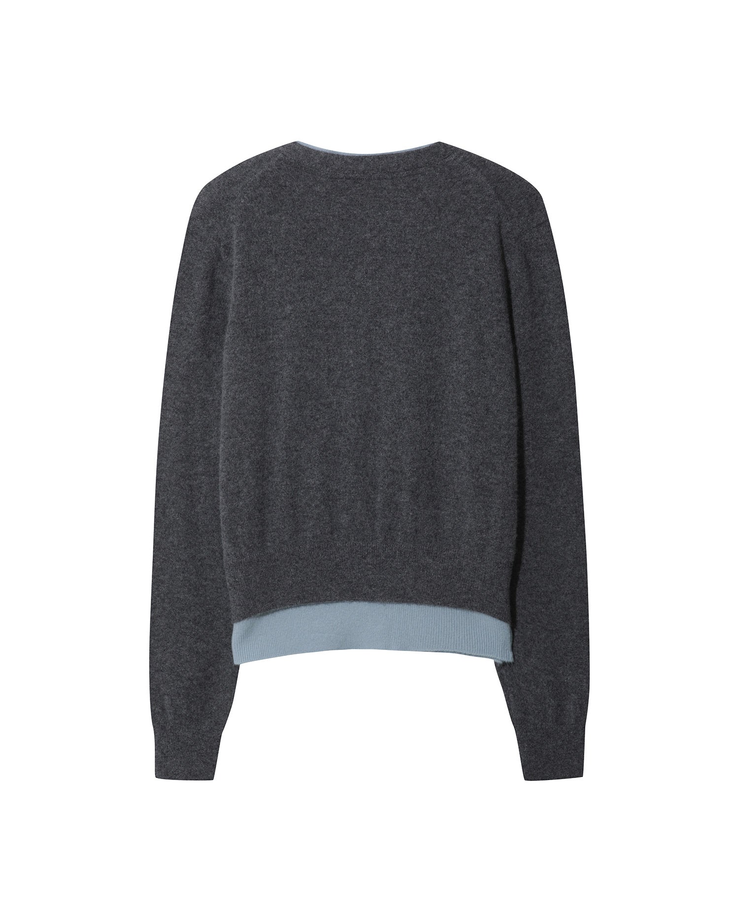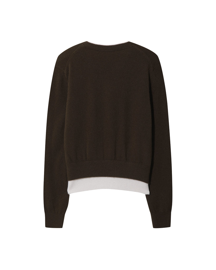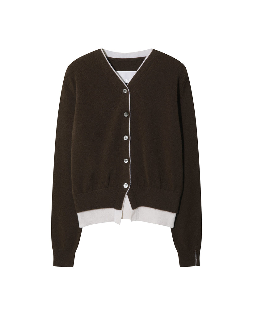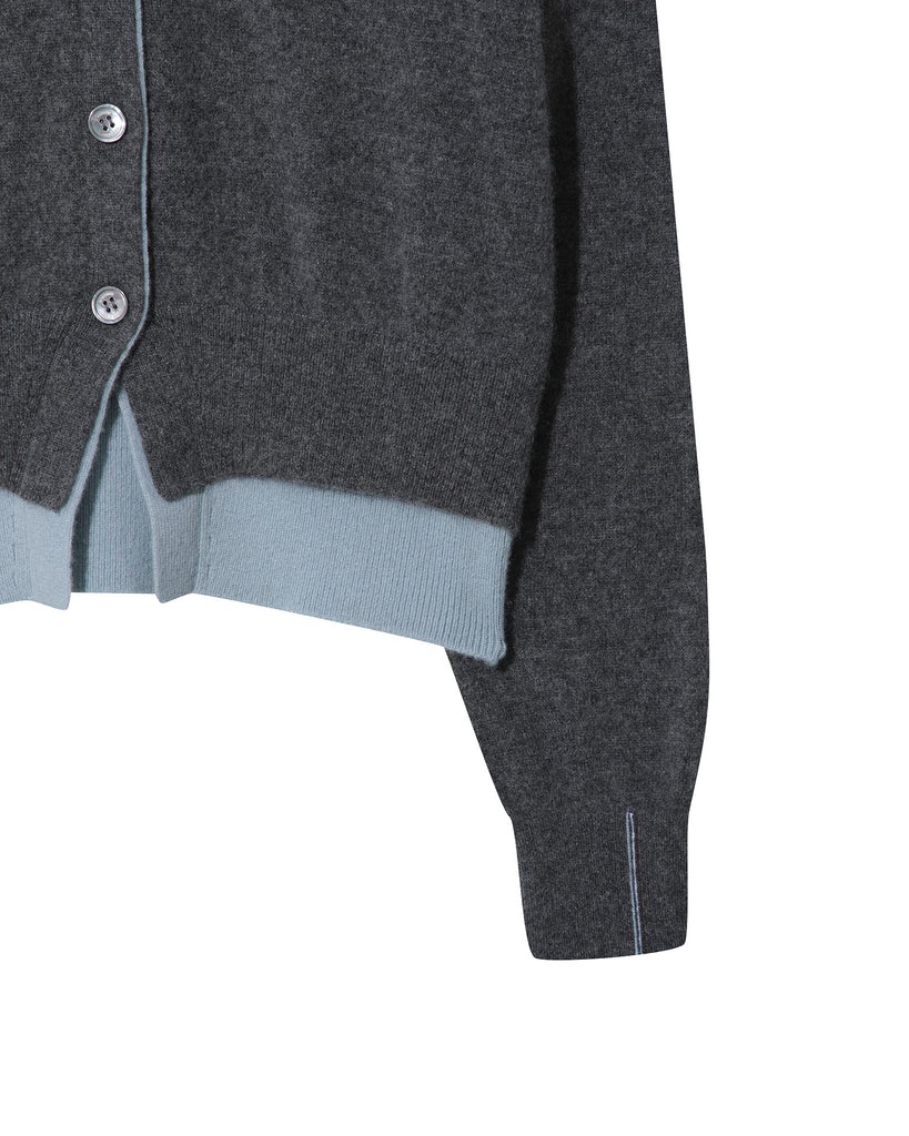 Cashmere cardigan that looks naturally layered on its own. In dark gray with light blue accents and brown with ivory tones, each colorway features a refined, effortless combination.
