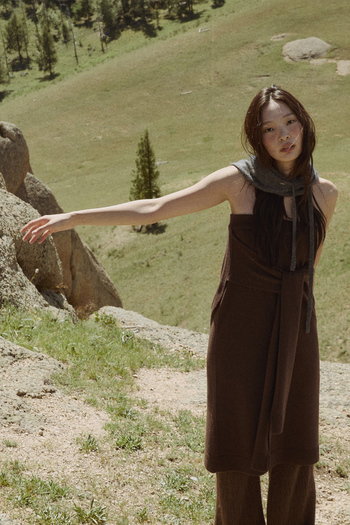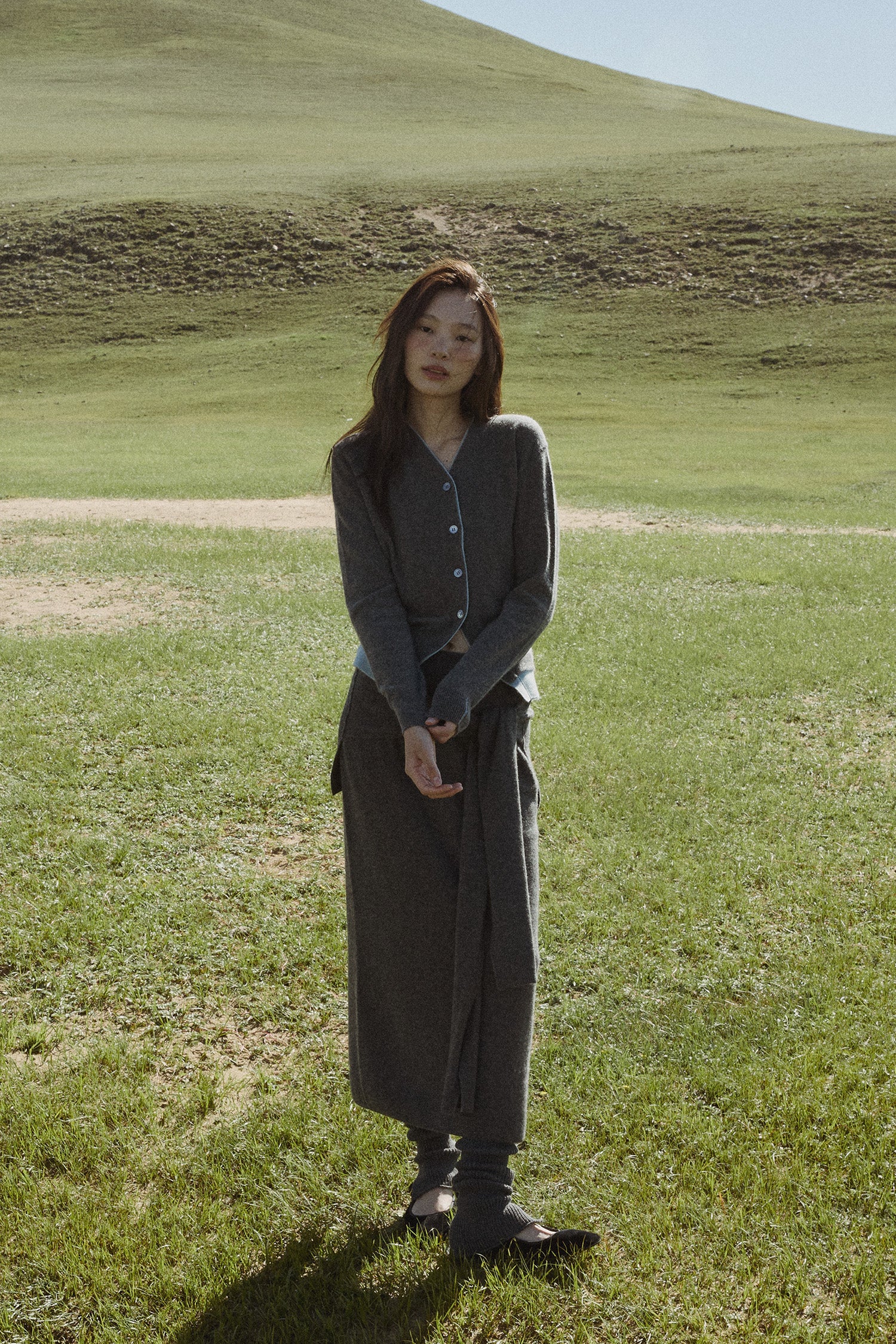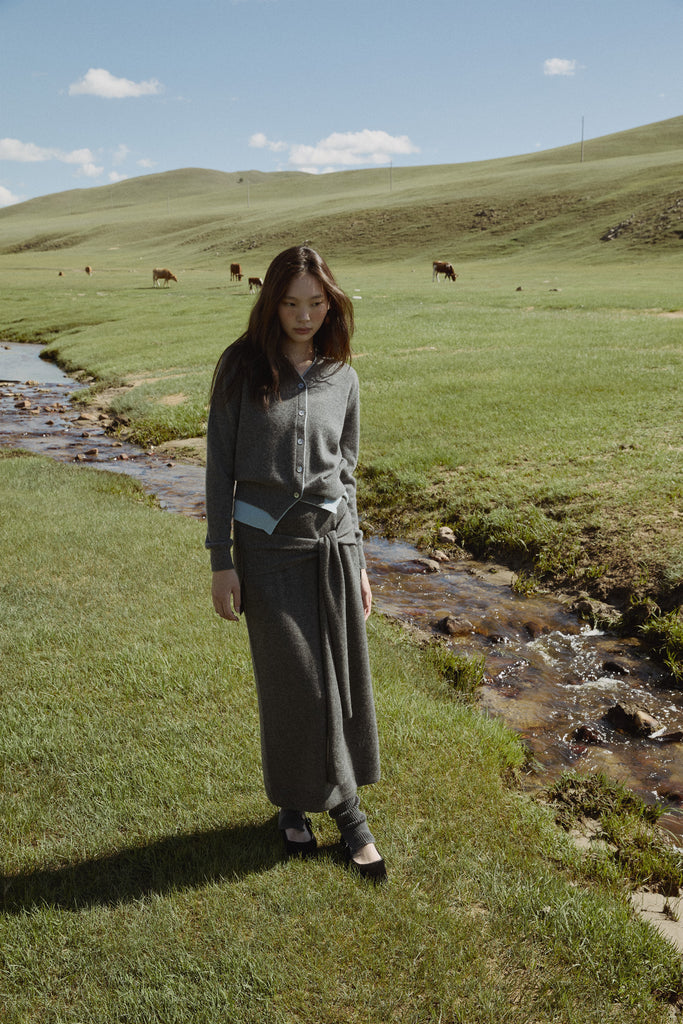 The front features a chic tie detail, while the layered back panel drapes naturally over the hips, creating an easy, effortless silhouette without any fit concerns. Though cut in a sleek H-line shape, the back slit lets you move with ease for all-day comfort. The maxi length brings extra versatility: pull it up and style it as a knit top for an unexpected look.